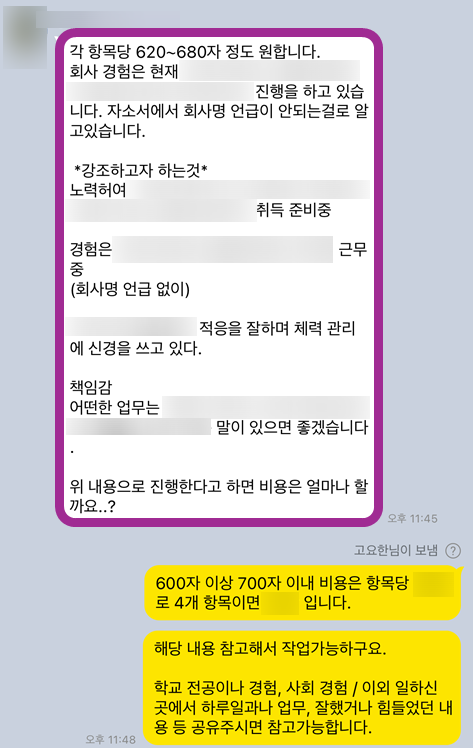 ✨보쉬 자기소개서 대필 성공! 외국계 대기업 합격 비법과 작성 노하우 A to Z 공개📝 안녕하세요! 👋 매년 수많은 분들의 꿈을 현실로 만들어드리는 자기소개서컨설팅입니다! 🚀 저는 매년 2000명 이상 자기소개서 컨설팅을 진행하며, 첨삭, 작성 대필, 작성대행 전문가로 활동하고 있어요. 수백 명의 합격 사례를 통해 쌓인 저만의 노하우를 바탕으로 📝 1. 자기소개서 첨삭 및 대행 2. 학업계획서 …